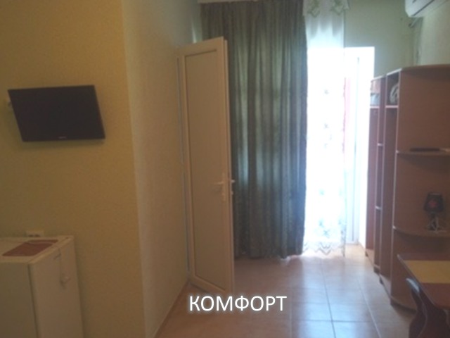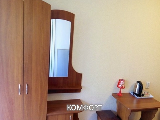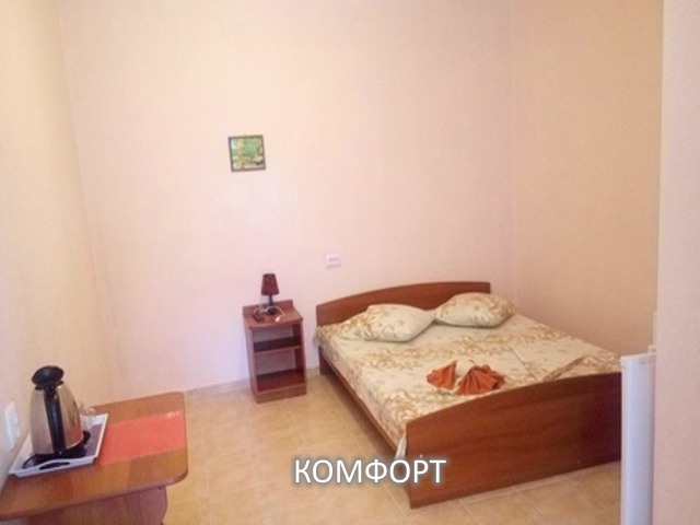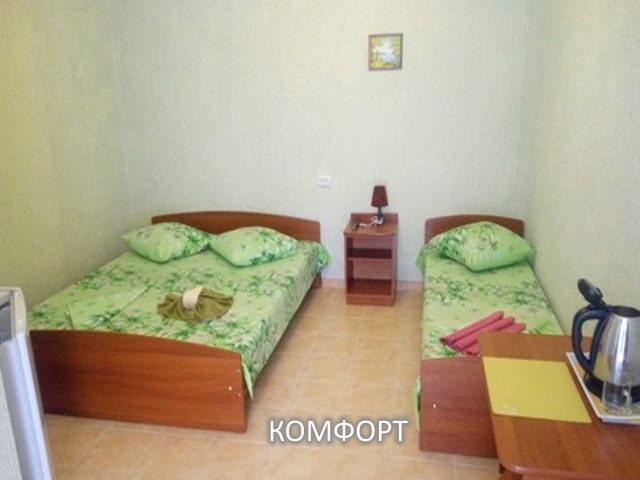 Номера КОМФОРТ: 2-3-х местные номера, 20 кв.м. Туалет, душ, умывальник, холодильник, телевизор, электрочайник, кондиционер, кровать, шкаф, тумбочка, стол и стулья в номере, а так же на террасе, 1-й и 2-й этажи