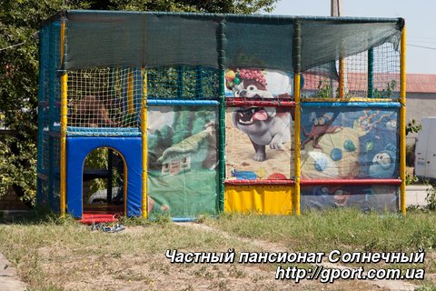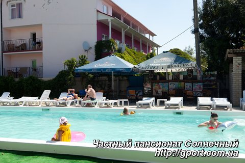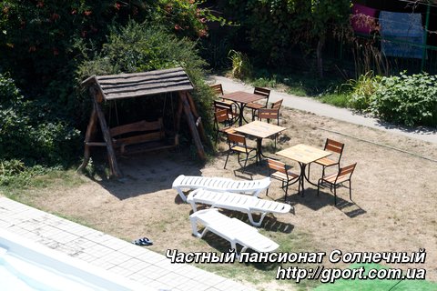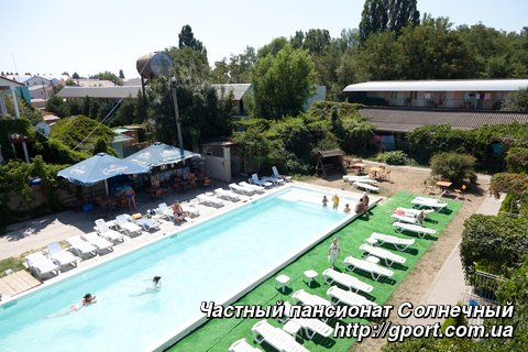 Инфраструктура: Территория пансионата утопает в зелени — персики, виноград, огромная зеленая лужайка, есть места для отдыха — беседки, мангал, качели, детский лабиринт, батут, песочница. Главным преимуществом данного пансионата является наличие БАССЕЙНА, одного из самых больших на курорте. Стоянка 20-25 гривен в сутки, в зависимости от размера авто.