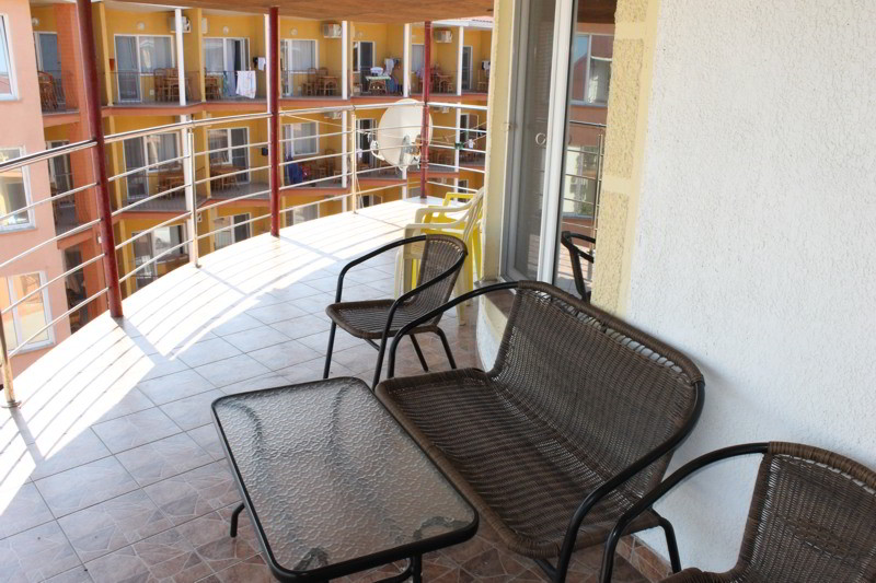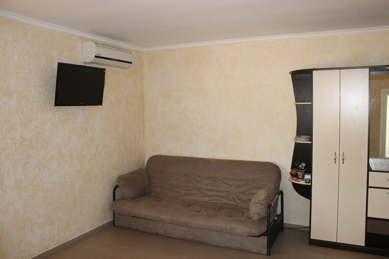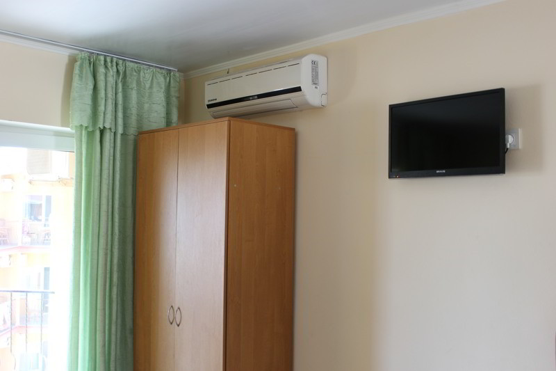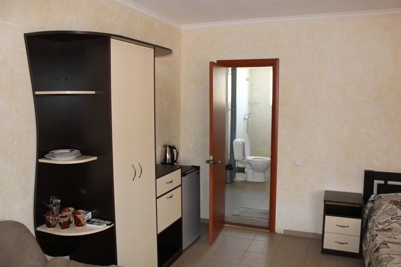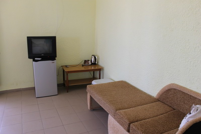 - Стандартный номер (2-3-х местный): телевизор, кондиционер, холодильник, набор мебели, санузел (душ, туалет, умывальник), чайник (по запросу), балкон с видом на море (боковой) и с уличной мебелью, бесплатный Wi-Fi;